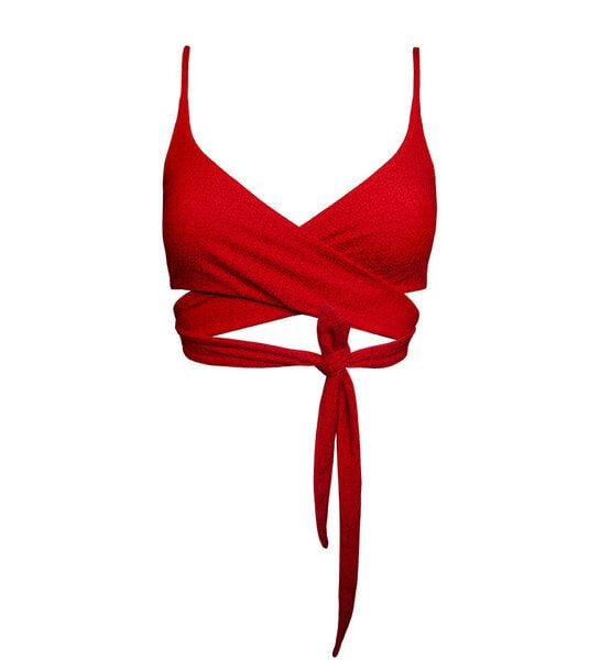 Ein rotes Wickel-Bikinioberteil mit verstellbaren Spaghettiträgern. Durch die Träger und die Wickeloptik entsteht nicht nur ein schönes Dekolteé sondern auch ein einmaliger Rückenausschnitt. Diese Version ist aus recyceltem Nylon mit kleinen Blumen im Stoff hergestellt, und das Futter besteht aus unserem widerstandsfähigen recyceltem Econyl-Stoff für langlebige Qualität. Mit nachhaltigen Materialien unter ethisch verantwortlichen Voraussetzungen in Polen hergestellt. Weil unser Style nicht die Welt kosten darf.
