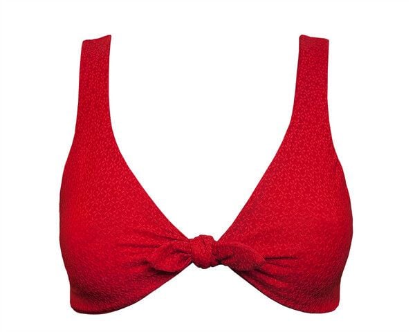 Rotes Bikinioberteil mit kleinen Blumen im Stoff. Es hat einen sportlichen Rücken und einem Bindeknoten vorne in der Mitte. Die Unterstützung kommt von Kompression wodurch eine schönes Dekolteé entsteht. Diese Version ist aus recyceltem Nylon mit kleinen Blumen im Stoff hergestellt, und das Futter besteht aus unserem widerstandsfähigen recyceltem Econyl-Stoff für langlebige Qualität. Mit nachhaltigen Materialien unter ethisch verantwortlichen Voraussetzungen in Polen hergestellt. Weil unser Style nicht die Welt kosten darf.
