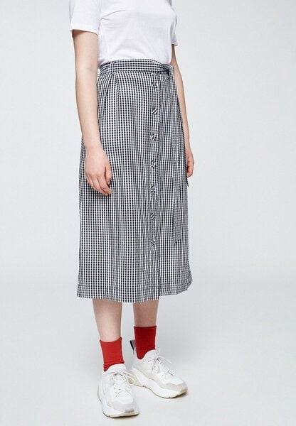 Modelgröße: Unser Model ist 1,76 m groß und trägt Größe S. Produktbeschreibung: Rock aus Bio-Baumwolle Herkunftsland: Türkei Details: Taillengürtel Material: 100% Baumwolle (bio) Passform: Regular fit Zertifizierung: GOTS, organic, CERES-08 Länge: 78cm Materialzusatz: Knöpfe aus Plastik Optik: Karo