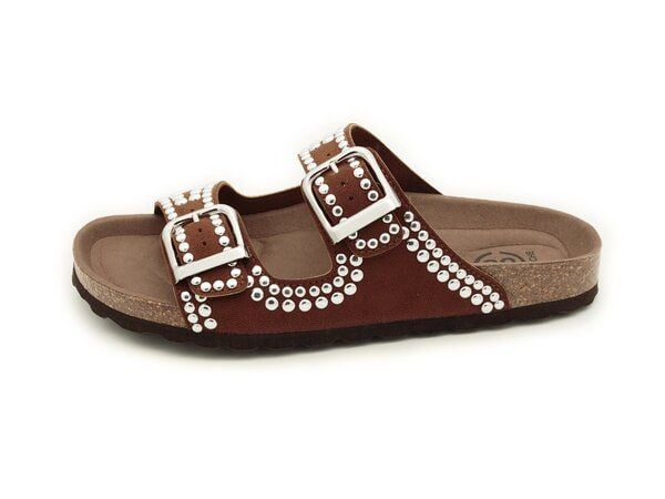 Vegane Zweischnallensandale mit dekorativem Nietenbesatz. Komfartable und chic – unsere Fussbettsandale für das Frühjahr und den Sommer. Look und Komfort auf höchstem Niveau.