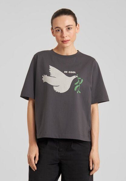 Ein moderner Twist auf das klassische Damen‑T‑Shirt: entspannter Schnitt mit längeren Kurzärmeln und cleanem Look. In dunklem Charcoal (Forged Iron) mit einem geradlinigen Frontprint – zentrierte Typografie in hellem Kontrast auf dem dunklen Hintergrund. Der Bio‑Baumwolljersey ist GOTS‑zertifiziert und Regenerative Organic Certified®; weich, atmungsaktiv und angenehm auf der Haut. Style es mit Straight‑Leg‑Denim und Sneakern oder gesteckt in einen Midirock mit Boots. – T-Shirt mit Tauben-Print – Relaxed Fit – Rundhalsausschnitt – Längere Kurzärmel – Weicher Single-Jersey – GOTS & ROC zertifiziert – Material: 100% Baumwolle (bio) (GOTS Certified by IDFL Licence no. 015691)