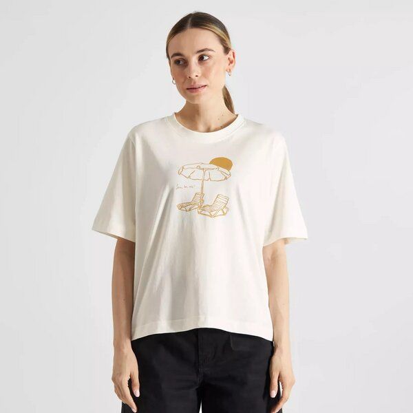 – T-Shirt Vadstena – Oversize Fit – Rundhalsausschnitt – Mit Strand-Print auf der Brust – GOTS, ROC and Fairtrade – Das Model ist 173 cm groß und trägt S – Material: 100% Baumwolle (bio) (GOTS Certified by IDFL Licence no. 015691)