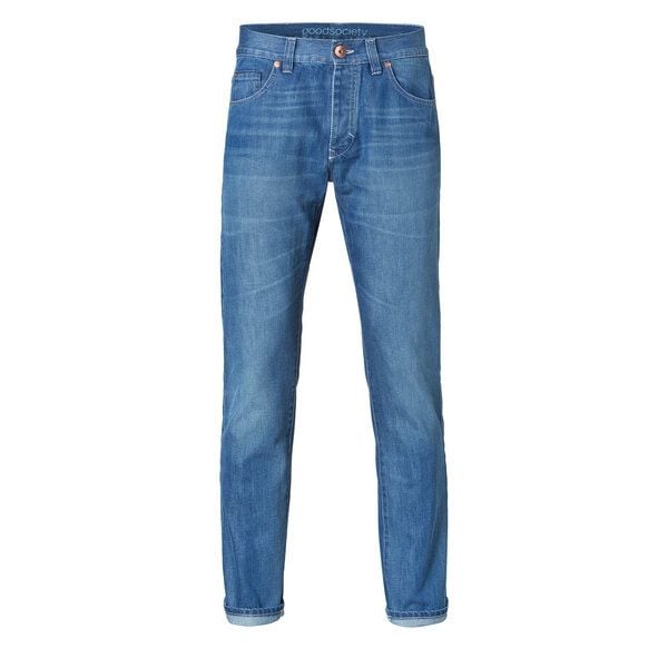 Achtung, die Jeans fällt eine Nummer kleiner aus, da in Italien anders gemessen wird. Bitte bestellen sie die Hose eine Nummer grösser als gewohnt falls sie noch keine goodsociety Jeans haben. Eine normal anliegende Passform mit normaler Taillenweite und schmalem geraden Bein. Ein blauer 12oz Denim, gefertigt in Italien aus feiner biologisch angebauter Baumwolle. Fest gewebt für eine dichte Oberfläche und schöne Haptik. Ein dry denim Look mit weichem Griff, durch einmaliges Waschen ohne Chemikalien. Die Veredlung erhält die originale, dunkle blau-weiße Oberfläche des Jeansstoffes, bei Einsparung von Wasser, Energie und Zusatzmitteln. Minimalistische Gesäßtaschen unterstreichen den klassisch schicken Look. Rotes Webkantenband und weißes, recyceltes goodsociety Logo. Knöpfe und Nieten sind, so weit wie möglich, aus recycelten Materialien gefertigt.