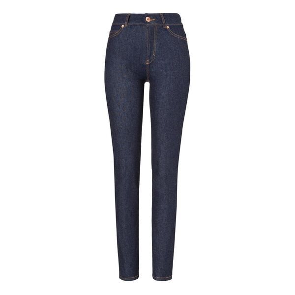 Eine eng anliegende Passform mit hohem Bund und schmalem Bein. Ein blauer 10,5oz Denim, gefertigt in Italien aus feinster biologisch angebauter Baumwolle. Fest gewebt mit hochwertigem Elasthan für eine dichte Oberfläche, höchste Bequemlichkeit und schöner Haptik. Ein dry denim Look mit weichem Griff. Die Veredlung erhält die original dunkle blau-weiße Oberfläche des Jeansstoffes, bei Einsparung von Wasser, Energie und ohne Verwendung von schädlichen Chemikalien. Die Veredlung erhält die original dunkle, blau-weiße Oberfläche des Jeansstoffes. Leicht geschwungene, asymetrische Gesäßtaschen-Details, unterstreichen den schicken femininen Stil. Rotes Webkantenband und grauer, veganer Backpatch mit goodsociety Logo. Knöpfe und Nieten sind aus 90% recycelten Materialien gefertigt.