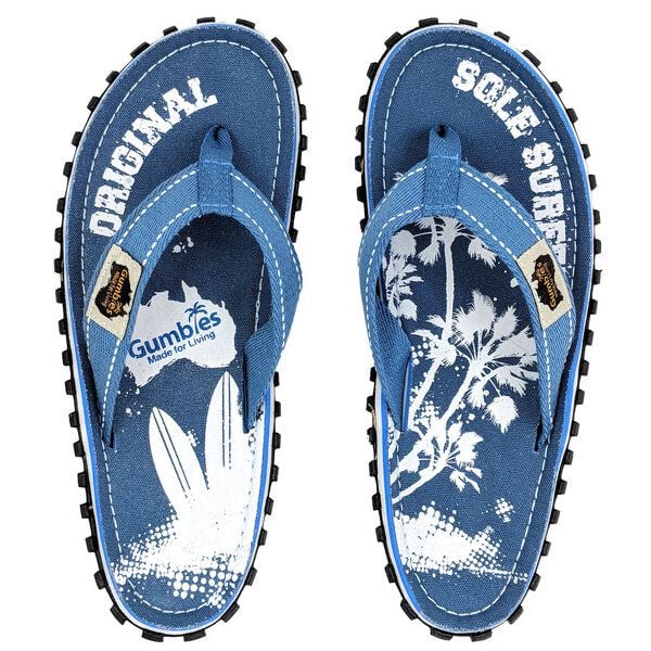 GUMBIES Palm – 100% vegan. Mit den GUMBIES hinterlässt du deinen Fußabdruck nur im Sand. Für uns ist Nachhaltigkeit besonders wichtig. Deswegen verwenden wir zur Herstellung der Strandschuhe recycelte Materialien. Die Sohle besteht aus recycelten Reifen und er Fußriemen aus recycelter Baumwolle. • Sohle besteht aus recyceltem Kautschuk • Besonders robuste Sohle für einen idealen Halt auf beinahe allen Untergründen • Fußriemen aus recycelter Baumwolle • Baumwoll-Zehensteg ist besonders weich und tragefreundlich • Ideales Tragegefühl durch das ergonomisch geformte Fußbett • Keine Verwendung von Polyester und Plastik Farbe: Meeresblau mit weißem Muster / blauer Fußriemen Größen: 36-46 GUMBIES sind super bequem und der Fußriemen ist mega weich. Du kannst den ganzen Tag durch die Stadt laufen oder am Strand spazieren. Kein Scheuern mehr zwischen den Zehen. Deine Füße werden dich dafür lieben. Als die Idee der GUMBIES entstanden ist, war der Grundgedanke, einen nachhaltigen Sommer-Schuh zu entwickeln. Die Grundlage hinter den GUMBIES bildet dabei die markante Sohle, die aus recyceltem Kautschuk sowie Jute besteht und perfekten Halt auf allen Untergründen bietet. Die einzige Spur, die unsere GUMBIES in der Natur hinterlassen, ist ein nachhaltiger Fußabdruck beim Laufen durch den Sand.