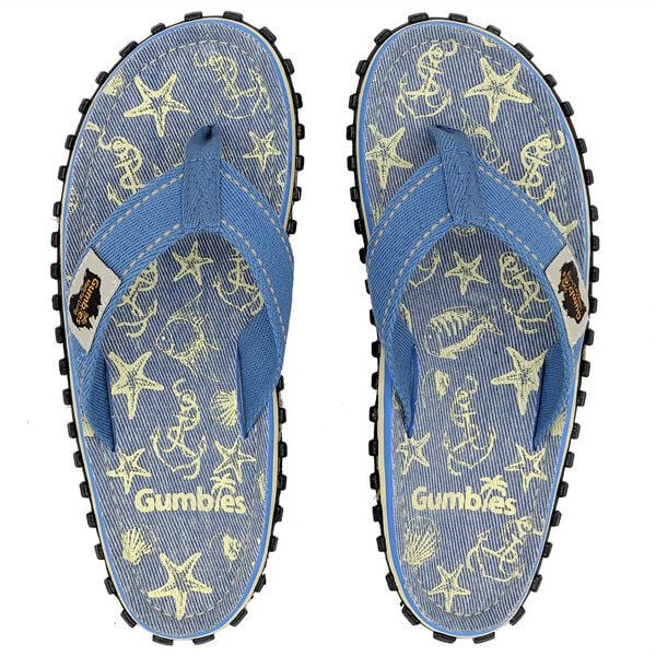 GUMBIES Seashells – Nachhaltigkeit auf allen Wegen. Wir achten bei unseren GUMBIES auf eine nachhaltige und ressourcenschonende Herstellung. Aus diesem Grund bestehen die Zehen-Sandalen aus recyceltem Material: Die Sohle ist aus recycelten Autoreifen hergestellt und ist mit Jute verschmolzen. Hierdurch wird sie überaus robust und bietet dir Halt auf fast allen Untergründen. Der Fußriemen besteht aus recycelter Baumwolle und ist super weich. • Sohle besteht aus recyceltem Kautschuk • Besonders robuste Sohle für einen idealen Halt auf beinahe allen Untergründen • Fußriemen aus recycelter Baumwolle • Baumwoll-Zehensteg ist besonders weich und tragefreundlich • Ideales Tragegefühl durch das ergonomisch geformte Fußbett • Keine Verwendung von Polyester und Plastik Farbe: Hellblau mit Meermuster / helblauer Fußriemen Einmal reingeschlüpft willst du deine Zehen-Sandalen von GUMBIES gar nicht mehr ausziehen. Super bequem gehst du wohin du willst: Egal ob du zu Hause bist oder spazieren gehst. Und das Beste: Der Baumwollzehensteg ist super weich. Das heißt endlich kein Scheuern mehr zwischen den Zehen. Deine Füße werden dich dafür lieben. Als die Idee der GUMBIES entstanden ist, war der Grundgedanke, einen nachhaltigen Sommer-Schuh zu entwickeln. Die Grundlage hinter den GUMBIES bildet dabei die markante Sohle, die aus recyceltem Kautschuk sowie Jute besteht und perfekten Halt auf allen Untergründen bietet. Die einzige Spur, die unsere GUMBIES in der Natur hinterlassen, ist ein nachhaltiger Fußabdruck beim Laufen durch den Sand.