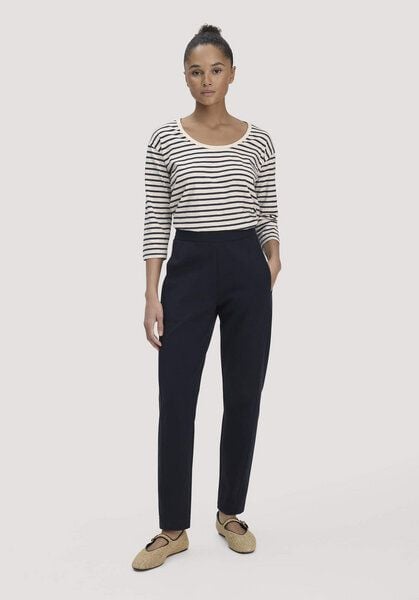 Bleibt glatt. Sitzt gut. Macht mit. Die knöchellange Hose im Regular Fit streckt das Bein optisch und ist dank geringem Elasthan-Anteil ausgesprochen bequem. Ideal für unterwegs – denn der aus bester Bio-Baumwolle gefertigte Punto di Roma Jersey ist stabil, wirkt angezogen und ist gleichzeitig super bequem. GOTS zertifiziert Bequeme Jerseyhose, knöchellang und High-Waist Gummibund und flexible Nahttaschen Pflegeleicht und unkompliziert findet sie immer wieder in ihre Form Regular: folgt der Körperform mit etwas Bewegungsspielraum Punto di Roma-Jersey: elastisch und stabil. Aus Bio-Baumwoll-Anbauprojekt in Griechenland