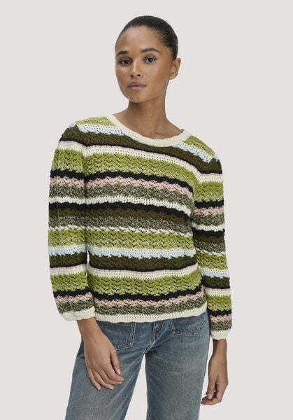 Lust auf Farbe, aber nicht laut? Hier entlang. Ajourmuster lassen Licht und Luft durch, die 3/4-Ärmel schwingen sanft mit. Und die Multicolor-Streifen? Sind nicht laut, gehen harmonisch miteinander in Verbindung. Ein Pullover, der Sommer kann – und Stimmung macht. GOTS zertifiziert Gestreifter Rundhalspullover Luftiger Midgauge-Strick, 3/4-Ärmel, weiche Kantenverarbeitung Lochmusterstrick in fein abgestimmten Farben Regular: folgt der Körperform mit etwas Bewegungsspielraum Beste Bio-Baumwolle – langlebig und weich verarbeitet