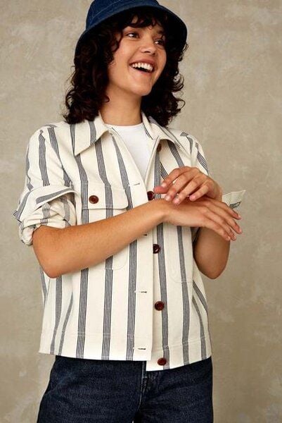 Lavinia Ecru Stripe Kurze Workwear-Jacke mit normaler Passform und zwei Brusttaschen mit Knopfverschluss. Die Jacke hat einen flachen Kragen und eine Knopfleiste. Mit vollständig biologisch abbaubaren Corozo-Knöpfen, die von einer tropischen Palme stammen, die hauptsächlich in Mittelamerika wächst. Aus recyceltem Polyester (gebrauchten Plastikflaschen) und recycelter Baumwolle (wiederverwendete Baumwollreste). Durch die Wiederverwendung von Baumwollresten sparen wir Wasser und vermindern CO2-Emissionen, die ansonsten für den Anbau neuer Baumwolle erforderlich sind bzw. dadurch entstehen würden. Das nennen wir umweltfreundliches Material.