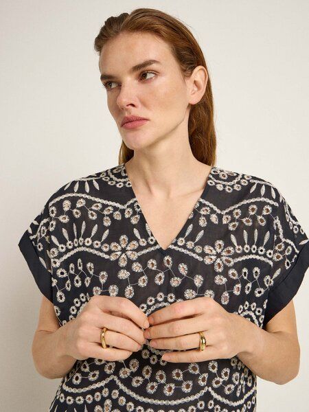 Mit seinem entspannten Schnitt bietet dieses Blusenshirt angenehme Bewegungsfreiheit und ein weiches Tragegefühl – ideal für warme Tage. Ein besonderes Highlight ist die detailreiche Stickerei, die dem Shirt eine individuelle, handwerkliche Note verleiht. Ob lässig kombiniert im Alltag oder elegant gestylt für besondere Momente – dieses nachhaltige Kleidungsstück verbindet modernen Look mit einem guten Gefühl.