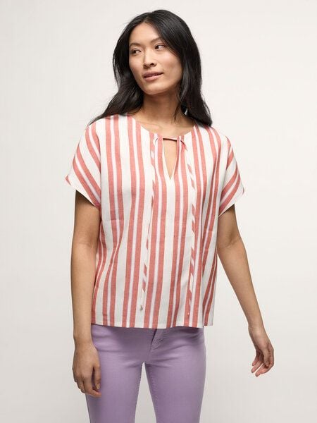 Leichte Bluse in legerer Silhouette und sommerlichen Streifen. Das sanfte Gefühl von Viskose und die natürliche Textur von Leinen ist angenehm auf der Haut und sommertauglich. Überschnittene Schultern, ein Bindeband am Rundhalsausschnitt und verkürzte, weite Ärmel sind Details für eine lockere Passform. Einfach zu kombinieren zu Leinenhose, Culotte oder Rock.
