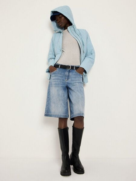 Leicht wärmend und angenehm reduziert: Diese dezent wattierte Jacke aus 100 % recyceltem, GRS-zertifiziertem Polyamid ist ein idealer Begleiter für die Übergangszeit. Das Material fühlt sich weich an und trägt sich besonders leicht, während die feine Wattierung für angenehme Wärme sorgt, ohne Volumen aufzubauen. Mit ihrem klaren Design, verdecktem Reißverschluss, Kordelzugkapuze und sanft gerundeter Saumlinie wirkt die Jacke modern und sportlich zugleich – unkompliziert kombinierbar und vielseitig einsetzbar.