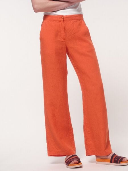 Französisches Sommerleinen: Die vegane Marlenehose mit geradem, weitem Bein, schräg eingelassenen Taschen und mittelhohem Bund ist die perfekte Sommerhose. Leinen ist ein natürliches, temperaturausgleichendes Material, angenehm auf der Haut zu tragen, mit leichter Struktur. Das Material lässt das Hosenbein beweglich fließen, die typische Marlenepassform ist so garantiert. Zum Hingucker wird der Look mit der passenden Hemdbluse oder dem Kleid in Wickeloptik und farblich passenden Pantoletten.