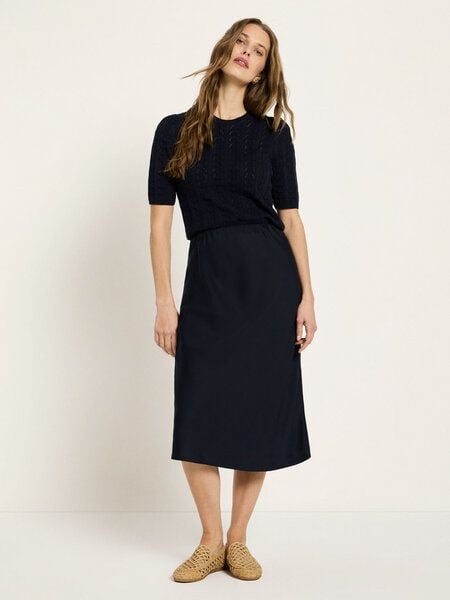 Schicker Rock in Midi-Länge für Damen aus fließendem Lyocell (TENCEL). Der Rock verfügt über eine klare Silhouette sowie einen Gummibund. Der Stoff ist besonders atmungsaktiv und fühlt sich weich auf der Haut an. Das minimalistische Design macht den Rock besonders vielseitig kombinierbar und ideal für warme Tage sowie für leichte und elegante Outfits. Die verwendeten zertifizierten TENCEL-Fasern werden besonders umweltfreundlich und ressourcenschonend hergestellt, aus verschiedenen Hölzern aus kontrolliert nachhaltiger Forstwirtschaft gewonnen und sind vollständig biologisch abbaubar. Lyocell TENCEL ist angenehm leicht auf der Haut und ideal für jedes Wetter. Material: 100% Lyocell (TENCEL) Made in: China