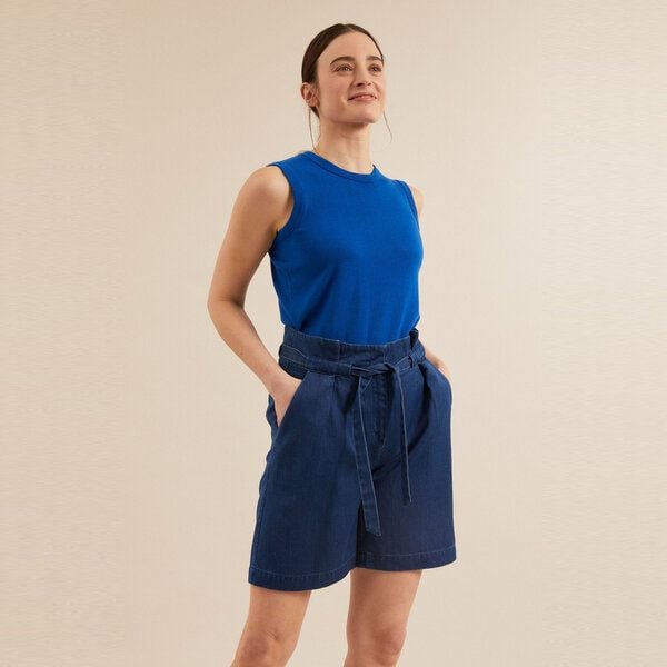 Paperbagshorts Denim Luftige Shorts mit hohem, gerafftem Bund. Das etwas längere Bein zeigt modische Länge und lässt sich bei Bedarf aufgekrempelt etwas kürzer tragen. Der variable Bindegurt lässt sich feminin mit Schleife binden. Die großen, aufgesetzten rückwärtigen Taschen sind ein lässiges Detail und geben Form. Die Webstruktur in Baumwolle (kbA) und Hanf gibt eine feminine Rustikalität und interpretiert Denim als modisches Statement. Besonderheiten: – Material: 87% Baumwolle (kbA), 13% Hanf (kbA) – Baumwolle aus kontrolliert biologischem Anbau (kbA) – Denimstruktur – hoher geraffter Bund – variabler Bindegurt – aufgesetzte Taschen – PETA-Approved Vegan Über das Material: Baumwolle (kbA) Die Bekannteste unter den Naturfasern: Die Baumwolle von LANIUS stammt aus kontrolliert biologischem Anbau (kbA) und wird dementsprechend gemäß der Richtlinien des ökologischen Landbaus produziert. Kontrolliert biologischer Anbau (kbA) verzichtet auf die Nutzung von künstlichem Dünger, Pestiziden und Gentechnik, die in der konventionellen Landwirtschaft zum Einsatz kommen. Stattdessen basiert der Anbau auf Fruchtfolge, tierischen und pflanzlichen Düngemitteln, biologischer Schädlingskontrolle und manuellem Jäten. Bei LANIUS werden zum größten Teil Baumwolle und Leinen aus kontrolliert biologischem Anbau (kbA) genutzt.