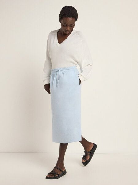 Baumwolle besticht durch seine dezente, leicht glänzende Oberfläche und ein besonders angenehmes Tragegefühl. Der elastische Gummibund mit Kordel sorgt für eine perfekte Passform und lässt sich individuell anpassen. Ideal für die warmen Tage, kombiniert er Komfort und Stil auf harmonische Weise. Ob leger mit einem T-Shirt oder elegant mit einer Bluse – dieser Rock verleiht deinem Look immer einen modernen, zugleich entspannten Touch.