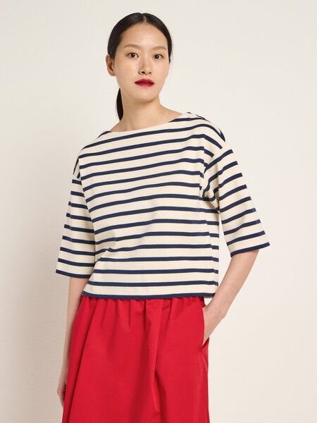 Der weiche, atmungsaktive Stoff sorgt für ein angenehmes Tragegefühl, während der raffinierte Streifen-Look für einen zeitlosen, maritimen Charme sorgt. Mit seinen 3/4-Ärmeln ist das GOTS-zertifizierte Shirt der ideale Begleiter für Übergangszeiten oder als Layering-Piece unter Jacken und Blazern.