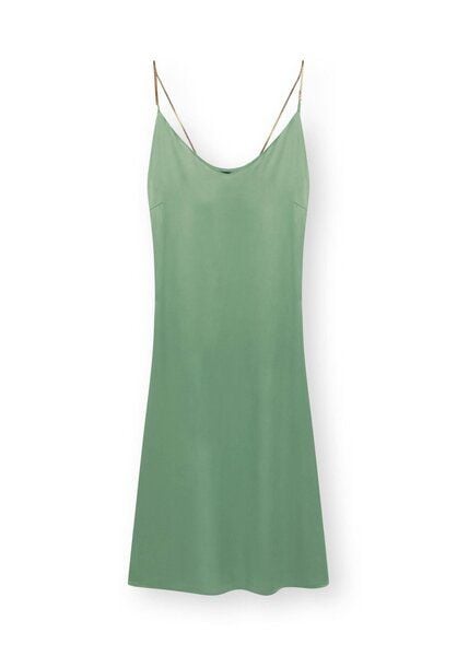 Ein Trägerkleid in Midi Länge mit dem gewissen Etwas: Glänzender Satin, gefertigt aus 60% nachhaltiger ENKA® Viskose und 40% LENZING ECOVERO, Metallkettchen-Träger, tiefer V-Ausschnitt. Das perfekte Partykleid. Kombiniere dieses Camisole Kleid mit einem unserer Pullover und Boots für einen Casual Look.