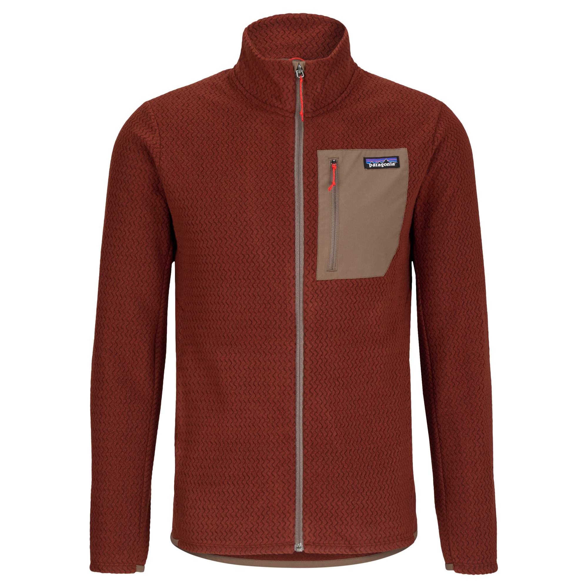 Fleecejacke mit besonderer Materialstruktur Der (berg-)sportlichen M’s R1 Air Jkt ist die effektive Isolationswirkung schon optisch anzumerken: Die Struktur sorgt hier für einen besonders hohen Wärmerückhalt und ein hervorragendes Klima. Für kaltes Wetter und anstrengende Aktivitäten Durch die Zickzack-Struktur kann die Fleecejacke aus Patagonias R1 Air-Kollektion mit einer hohen Isolationsleistung aufwarten: In den Hohlräumen wird deine Köperwärme nämlich besonders effektiv gespeichert, ohne dass die Jacke dick auftragen würde. Spezielle Hohlkammern in den Garnen verstärken die hohe Isolationsleistung zusätzlich. Gleichzeitig sorgt das komplett recycelte Polyester-Material zusammen mit der Zickzack-Struktur für ein ausgezeichnetes Feuchtigkeitsmanagement, die Jacke trocknet nach schweißtreibendem Einsatz also schnell wieder. So trägt sich die R1 Air Jacket auch beim Trailrunning, Klettern, auf Skitouren und anderen intensiven Sportarten bei kühlem Wetter sehr angenehm. Tourentauglich Die Fleecejacke eignet sich hervorragend als Isolationsschicht unter einer Shell-Jacke oder als äußere Lage bei milderen Temperaturen. Durch die spezielle Struktur lässt sich die Jacke klein verpacken und eignet sich damit auch sehr gut für mehrtägige Touren mit schmalem Gepäck. Die praktische Reißverschluss-Tasche rundet das schöne, sportliche Design der R1 Air Jkt ab. Details Hohlfaser-Material mit Zickzack-Struktur leitet Nässe ab und trocknet rasch Dank Material perfekt geeignet für anstrengende Aktivitäten Versetzte Schulternähte, komfortabel unter Schultertragegurten vom Rucksack Mit einer RV-Brusttasche Elastische Einfassungen hinten am Saum und an den Bündchen für besten Sitz Komplett aus Recycling-Polyester bluesign zertifiziert FairTrade-zertifiziert