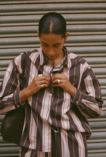 Das Hemd Lucile ist ein zeitloses Kleidungsstück. Es ist aus Popeline aus Bio-Baumwolle gefertigt und hat ein unregelmäßiges Streifendesign in Braun-, Pflaumen- und Cremetönen. Die langen Ärmel und der lockere Schnitt machen es zu einem bequemen und leichten Kleidungsstück, das sich perfekt für die Übergangszeit eignet. Das Hemd Lucile kann mit der Hose Mathilde aus demselben Thema für einen Total Look kombiniert werden oder mit der Hose Camille aus Ecru-Leinen für einen Look mit Farbkontrast und einem schönen Materialmix. Zusammensetzung und Pflege Hauptmaterial: 100% Baumwolle aus kontrolliert biologischem Anbau