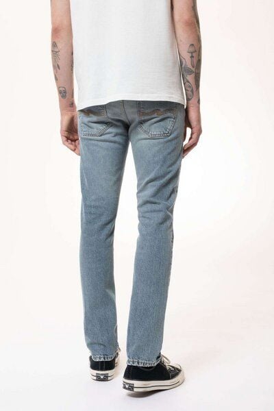 Schmal geschnittene Jeans in blauem 13 oz Comfort Stretch Denim mit schmal zulaufendem Bein und engem Beinabschluss. Waschung: Cloud Blue Material: 99% Baumwolle (bio), 1% Elasthan Details: veganes Jacron-Patch (Papier) Made in: Tunesien