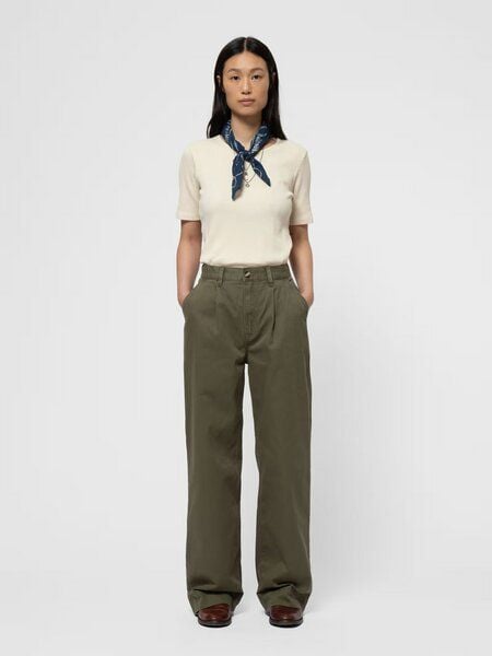 Suki – die Matrosenhose mit Bundfalten. Mit einem hohen Bund und weitem Bein besticht diese Hose durch ihre kunstvolle Workwear-Ästhetik. Hergestellt aus hochwertigem Fischgräten-Twill, bietet der Stoff eine dicht gewebte, leicht knackige Textur, ein angenehmes, trockenes Gefühl und einen cleanen Look. Das Fischgrätmuster zollt klassischen Twillstoffen Tribut und um Langlebigkeit und Alterungsbeständigkeit zu gewährleisten, hat Nudie Jeans ihn in einem perfekten Olivton stückgefärbt. Durch eine sanfte Spülung kommen die einzigartigen Eigenschaften des Stoffes und die durchdachte Konstruktion besonders gut zur Geltung. Kombiniere Suki mit unserer Bibbi Jacket für einen perfekten Look. Bio-Baumwolle Starrer Fischgräten-Twill Farblich abgestimmte Nähte an den Säumen Schildpattknopf Reißverschluss Vier Taschen Gewebter Patch Normale Passform Hoher Bund Weites Bein Weiter Beinabschluss 100% Baumwolle Hergestellt in TN