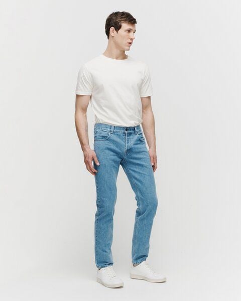 DIE PASSFORM Mit einem klassischen geraden Schnitt ist unsere Jeans die perfekte Hose für jeden Körpertyp. Ein etwas enger geschnittenes Bein in Kombination mit dem hochwertigen Jeansstoff sorgt dafür, dass die natürlich fallende Hose mit deinen Schuhen harmoniert. DAS MATERIAL Der Stoff der perfekten Jeans besteht aus 100% Baumwolle, hergestellt in Italien. Er setzt sich aus 24% Post-Consumer-Recycelter Baumwolle und 76% Blue Seed Bio-Baumwolle zusammen. Es handelt sich dabei um eine Art der Baumwolle, die aus längeren Fasern als herkömmliche Baumwolle besteht, und somit sanfter und resistenter ist. Zudem ist Blue Seed nachhaltiger, da sie weniger Wasser und keine toxischen Chemikalien beansprucht. DER STOFF Der klassische 13,5 oz Denim bietet ein einzigartiges Tragegefühl. Unser 3/1 Z-Grat-Köper sorgt für einen besonders weichen Griff, ohne dabei auf die Qualität eines festen und langlebigen Jeansstoffs zu verzichten. Die offenmaschige Struktur des Gewebes sorgt zusätzlich für Strapazierfähigkeit und langlebige Qualität.