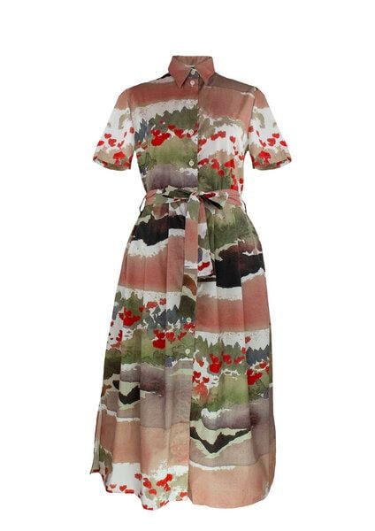 Der Schnitt Marie ist der absolute Klassiker und Must Have in jeden Kleiderschrank. Luftig, leicht ist das Hemdkleid mit den Schlitzen an den Seiten, die bis zu den Knien gehen, und sehr komfortabel mit den Seitentaschen, die Falten runden den mediterranen Look ab. Trage die Ärmel lang oder hochgekrempelt. Im Sommer 1986 aquarelliert der Architekt Paul Schneider-Esleben in Südfrankreich, am Rande der Weinberge den Blick auf die Baie de la Briande, an der Côte d’Azur. Umgeben von Zikaden, Rosé und seinem kleinen, handlichen Aquarellkasten, den er auf allen Reisen mit sich nimmt, malt er die Bucht in den Jahreszeiten des Mohns und der Mimosen. 2020 wird aus diesem Moment die faire EcoKollektion „Hommage 4“ von Sophia Schneider-Esleben. Sie digitalisiert die Werke und läßt sie auf BioBaumwolle, mit trinkbaren BioFarben drucken, made in Germany und in Litauen bei 100% Women Power nähen. Die Kollektion ist ageless, unisex, business and casual approved und präsentiert in 2020 die Leichtigkeit des französischen Lebens.