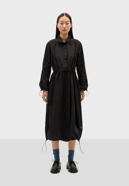 Vielseitiges langarm Maxi Kleid Kusama von Thinking Mu aus fester Biobaumwolle. Das Kleid kann durch die durchgehenden Druckknöpfe auch als Mantel getragen werden. Durch das Schnürsystem an den Ärmeln und am Saum ist es individuell anpassbar. – 100% OCS zertifizierte Biobaumwolle – seitliche Taschen – hoher Kragen – Zugband in der Taille – maschinenwaschbar bei 30 Grad