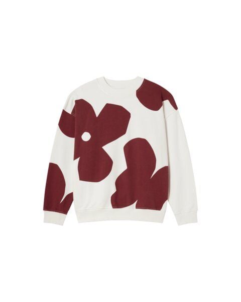Sweatshirt aus Bio-Baumwolle mit Riesenblumen und -Schmetterlingen Normaler Schnitt Rundhalsausschnitt Lange Ärmel Hergestellt in Indien (Stoff, Färben und Konfektion) Maße in Größe S: 63 cm Gesamtlänge, 56 cm Rückenbreite und 52 cm Ärmellänge.