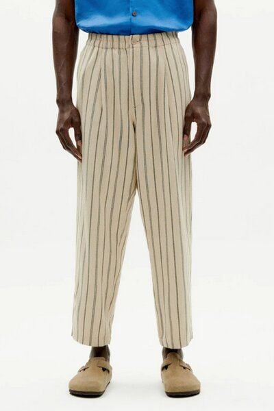 Lässige, cremefarbene Baumwoll-Hose mit schwarz-schraffierten Vertikalstreifen. Mit elastischem Bund, Knopf und Reißverschluss sowie Seiten- und Hintertaschen. Angenehme, leicht raue Textur.