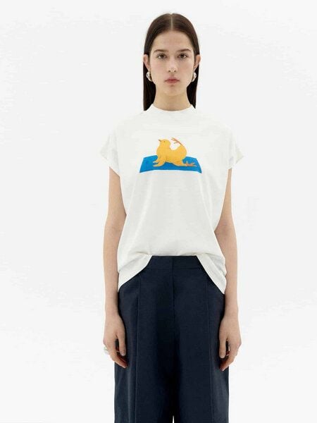 Das „Yogui Animal Volta T-Shirt“ von Thinking MU überzeugt mit einem verspielten Design: Eine kleine gelbe Ente, die auf einer blauen Matte Yoga praktiziert, schmückt die Brust und zaubert ein Lächeln ins Gesicht. Der charakteristische Volta-Schnitt mit hochgeschlossenem Rundhalsausschnitt und umgeschlagenen Ärmeln verleiht dem Shirt eine stilvolle und zugleich bequeme Passform – perfekt für entspannte Augenblicke.