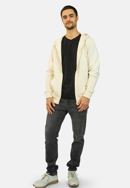 Der CONNECTOR ist ein klassischer Kapuzensweater mit Reißverschluss. Er kombiniert sportlichen Look mit Komfort und umweltfreundlichen Materialien, ideal für mode- und umweltbewusste Männer. Materialien und Details: – 85% gekämmte ringgesponnene Biobaumwolle, 15% recyceltes Polyester – Terry, 300 g/m² – zertifiziert nach GOTS (CERES-0768) – eingesetzte Ärmel – Kängurutasche mit Flatlock-Absteppung – Kapuze mit Jerseyfutter – 1×1 Rippstrick an Ärmelenden und unterem Saum – Flatlock-Absteppung auf allen Nähten – bei 30°C waschbar, Bügeln erlaubt Markus ist 1,85 m groß und trägt Größe L.