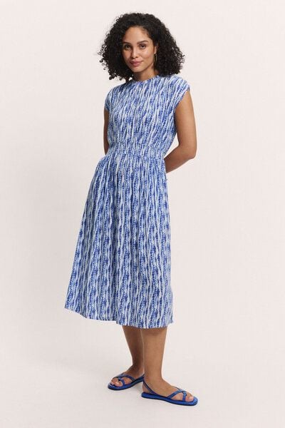 Fair. Bequem. Eco Vero Crinkel. Dieses vielseitige Kleid lässt sich perfekt zu Sneakern oder einer Strickjacke stylen. Hergestellt aus 100% Crinkle Viskose, bietet es hohe Qualität und Nachhaltigkeit. Besonders charmant sind die gesmokten Details, der Gummizug in der Taille, die dem Kleid eine verspielte Note verleihen. Der kniebedeckter Midi-Schnitt, die überschnittenen Ärmel machen es zu einem stilvollen und bequemen Allrounder. Highlights: Material: 100 % EcoVero Viskose by Lenzing Nachhaltiges CrinkleEco Vero Viskose verspielte gesmokte Details verschiedene Designs Gesamtlänge 114 cm