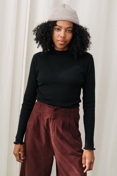 Dieses leichte, luftige Oberteil begeistert mit subtilen vertikalen Rippstrukturen und charmant fransigen Kanten. Der leicht höhere Kragen verleiht extra Gemütlichkeit. Es handelt sich um eine bequeme Regular-Fit-Silhouette, die Sie immer wieder gerne tragen werden. Hergestellt aus 100 % Bio-Baumwolle, pestizidfrei und mit reduziertem Wasserverbrauch. Vegan. Das Model ist 1,73 m groß und trägt Größe S. Perfekt für einen stilvollen und nachhaltigen Look.