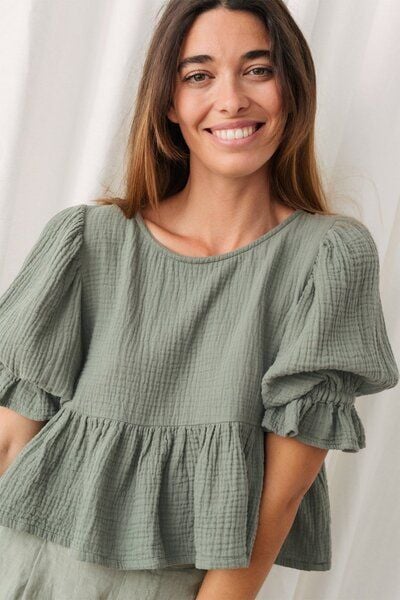 Aus luftig-leichter Bio-Musselin gefertigt, ist der Vasilyevsky eine verkürzte Bluse mit übergroßen Ärmeln und elastischen Bündchen, die über dem Ellenbogen enden. Ein lässiger Schnitt, der den Frühling/Sommer liebt! Designt in Barcelona. Hergestellt in Portugal. 100% Bio-Baumwoll-Musselin. Pestizidfrei und reduzierter Wasserverbrauch. Vegan. Das Model ist 1,77 m groß und trägt Größe S.