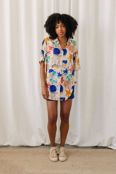 Dieses Hemd hat einen farbenfrohen Print und einen lockeren Schnitt. Es ist in den Größen XS bis XL verfügbar, mit einer Schulterbreite von 43 cm bis 47 cm und einer Brustweite von 58,5 cm bis 66,5 cm. Die Gesamtlänge variiert von 76 cm bis 84 cm, und die Ärmellänge reicht von 24,9 cm bis 26,9 cm. Das Modell ist 1,73 m groß und trägt Größe S. Das Produkt ist neu im Sortiment und auf Lager, mit einer Vorbestellungsoption ab dem 28.02.2025. 100% LENZING ECOVERO Viscose