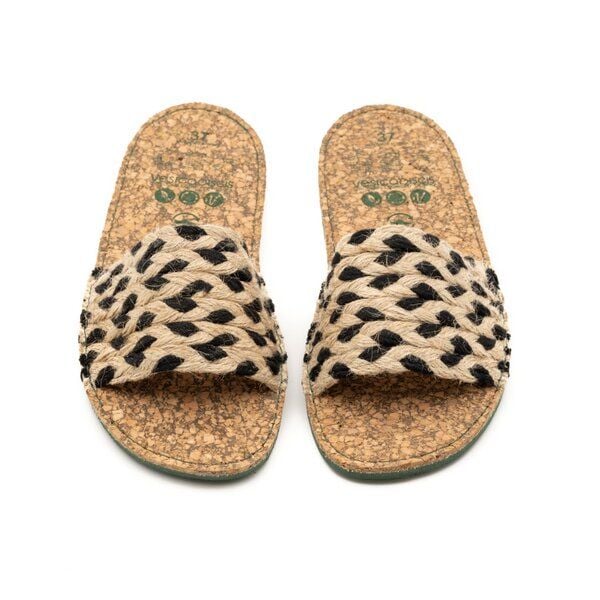 Die leichte LISA Sandale ist perfekt für warme Sommertage! LISA Schläppchen, handgefertigt in Vesica Pisces eigener Werkstatt in Spanien aus schwarzem recyceltem PET und Juteseil. Vulkanisierte Innensohle aus recyceltem Kork von Flaschenkorken und Naturlatex. Größe und Logo mit Öko-Tinte grün markiert (lösungsmittelfrei). Alle auf die recycelte EVA-Außensohle genäht (GRS-global recycelt standardzertifiziert). für optimalen Komfort und Leichtigkeit. Die Innsensohle ist aus recycelten Kork (aus Weinkorken) und Latex flexible Außensohle aus recycelten EVA komplett vegan ohne tierische Bestandsteile Lieferung im unbedruckten Recyclingkarton