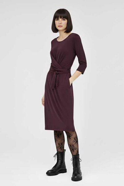 JERSEYKLEID SLINGA IN BEERE – FEMININES MIDIKLEID AUS BIO- BAUMWOLLE ELEGANTES JERSEYKLEID MIT WICKELEFFEKT Das Jerseykleid SLINGA in Beere ist ein echtes Lieblingsstück für alle, die feminine Eleganz mit Tragekomfort verbinden möchten. Der schmeichelnde V-Ausschnitt und die ¾-Ärmel sorgen für eine zeitlose Silhouette, während der ausgestellte Rock locker über das Knie fällt und Dir optimale Bewegungsfreiheit schenkt. MIDIKLEID MIT BINDEGÜRTEL – VIELSEITIG TRAGBAR Das Highlight dieses Kleides sind die integrierten Bindebänder, die Du individuell wickeln kannst – vorn geknotet, seitlich gebunden oder locker im Rücken – je nach Stimmung und Anlass. So entsteht immer wieder ein neuer Look. ALLTAG, BÜRO ODER DINNER – DEIN KLEID FÜR JEDEN MOMENT Ob im Büro mit Blazer, beim Familienessen mit Strickjacke oder im Alltag mit Sneakern – SLINGA begleitet Dich überall. Der tiefe Beerenton bringt Wärme in Deine Garderobe und lässt sich wunderbar mit Creme, Grau oder Dunkelblau kombinieren. NACHHALTIG UND FAIR PRODUZIERT achhaltig & fair produziert Das Kleid wird aus hochwertiger Bio-Baumwolle aus kontrolliertem Anbau gefertigt – weich, atmungsaktiv und langlebig. Produziert wird es in unserem Partnerbetrieb ABE in Legnica (PL) unter fairen Arbeitsbedingungen. MATERIAL 95% Baumwolle (aus kontrolliert biologischem Anbau), 5% Elastan Nach höchsten ökologischen Standards gefertigt. PFLEGEHINWEIS 30°C Feinwäsche im Waschbeutel