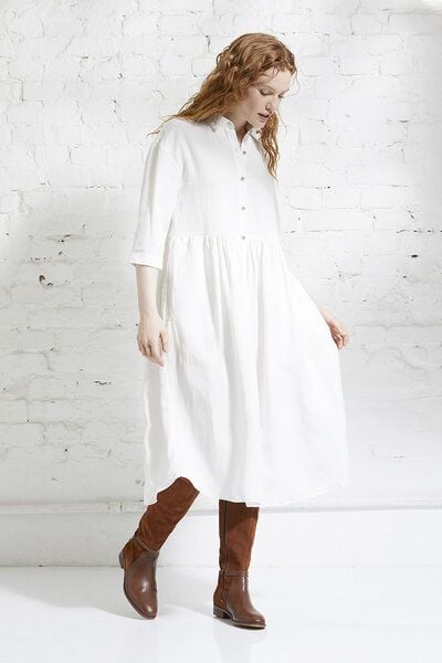 Leichtes Sommerkleid mit besonderem Schnitt. Die höher angesetzte, locker sitzende Taille und der weitschwingende Rock verleihen dem Kleid etwas mädchenhaft Verspieltes. Die 3/4 Ärmel können nach Wunsch locker umgekrempelt werden und die Knopfleiste am Oberteil zieren Knöpfe aus Steinnuss. Ein Leinenanteil verleiht dem leichten Kleid aus Tencel eine schöne Struktur. Ein perfektes Kleid für warme Tage und laue Nächte. 75% Lyocell (TENCEL), 25% Leinen Unser wunderwerk premium-TENCEL verzichtet im Herstellungsprozess komplett auf die Chemikalien Chlor und Formaldehyd. Im Gegensatz zu „gewöhnlichem“ Lyocell ist es nochmal feiner und weicher auf der Haut. Steinnussknöpfe aus Deutschland Vegan Made in Portugal